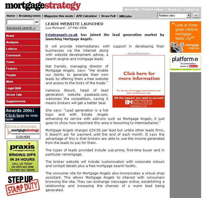 - "Mortgage Angels offers lead generation incentive", Best Advice (Mar 06)
